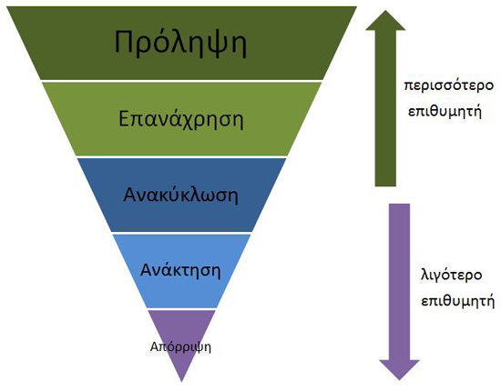 Η εναλλακτική διαχείριση στην Ευρωπαϊκή Ένωση καθώς και στην Ελλάδα βασίζεται στην ιεραρχία διαχείρισης αποβλήτων όπως αυτή απεικονίζεται στην παρακάτω πυραμίδα.
