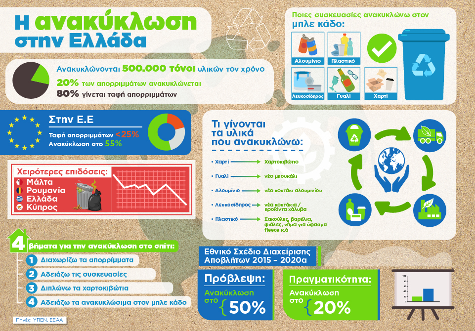 Χαρακτηριστικό της αναγκαιότητας μέτρων είναι ότι στην Ελλάδα η ανακύκλωση απορριμμάτων κινείται στο 20%, όταν ο ευρωπαϊκός μέσος όρος κινείται στο 50%. Χαρακτηριστικό είναι επίσης ότι στο ζήτημα της ταφής η Ελλάδα έχει «αρνητικό ρεκόρ» καθώς «θάβεται» το 79% των απορριμμάτων, όταν ο ευρωπαϊκός μέσος όρος κινείται στο 20%.